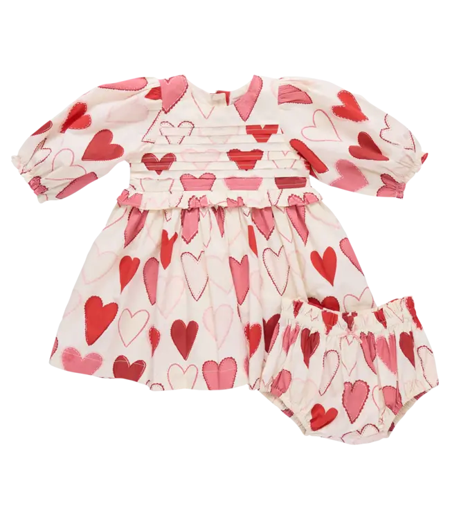 The Renee Dress features dreamy gradient hearts, soft puff elastic sleeves, delicate pleats, shimmering pink glitter buttons, and charming ruffle details. Includes a coordinating diaper cover with a pink satin bow for an extra-special Valentine’s touch.