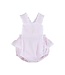 The Pink Seersucker Easter Bunny Ruffle Romper is crafted from soft pink seersucker cotton, featuring sweet ruffle details, delicate lace accents, a bow on the back, and an adorable embroidered bunny.