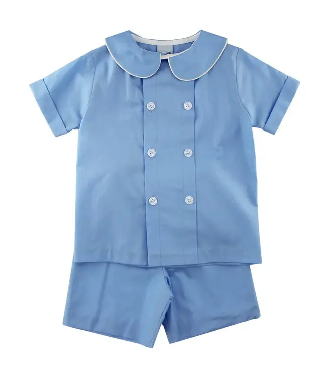 Bailey Boys' Summer Blue Dressy Short Set reflects quiet refinement in soft, serene tones. The simple tailoring and pastel hue create a versatile look for spring and summer gatherings. A true classic that balances charm and comfort.