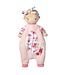 Pastel pink materials make up her snuggly pajama body, while a flowery print accents her belly, sleeves, and headband. Only lightly stuffed, Vera is a unique companion in that she is both a doll and blankie friend all at once!